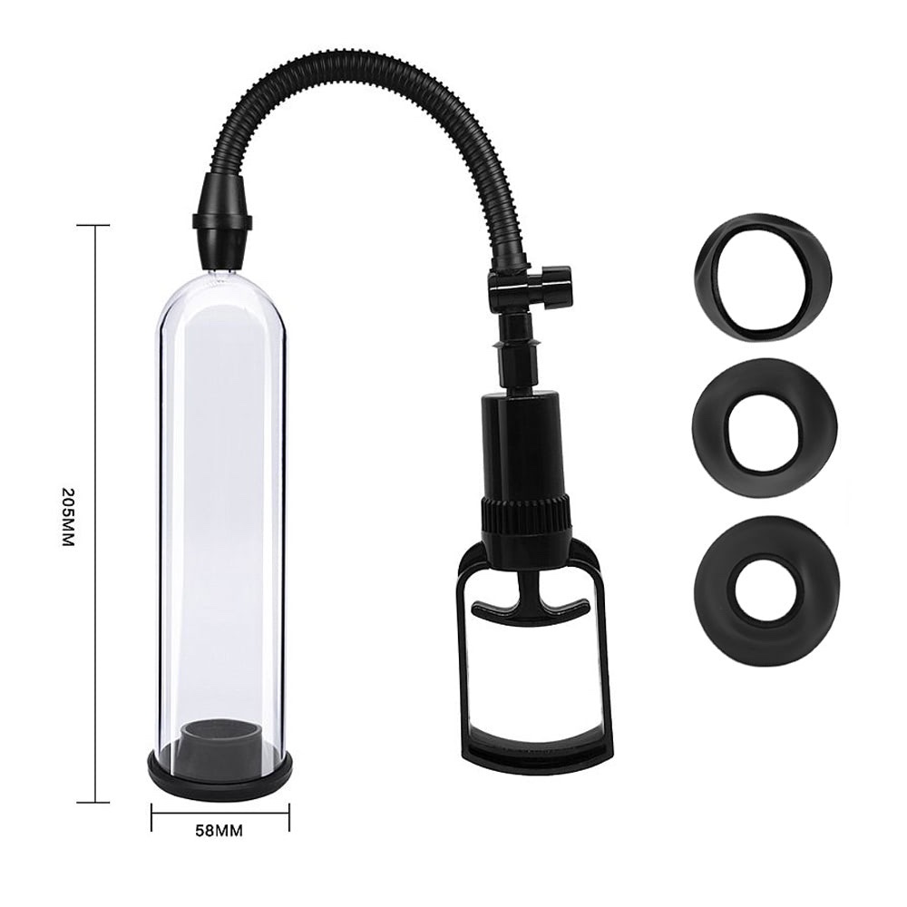 Equipada com gatilho manual, a bomba permite ajustar a sucção de forma gradual e segura, respeitando os limites do corpo. O kit acompanha três anéis em silicone de tamanhos diferentes, garantindo encaixe confortável, retenção sanguínea eficiente e adaptação personalizada para cada usuário.