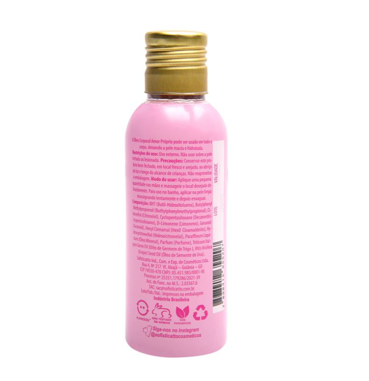 Amor Próprio Óleo Corporal 120ml Sofisticatto é um convite para se cuidar, se sentir e se valorizar. Com hidratação intensa, fragrância sofisticada e toque envolvente, ele transforma massagens e banhos em experiências sensoriais luxuosas. Um verdadeiro ritual de prazer, autoestima e conexão com o próprio corpo.